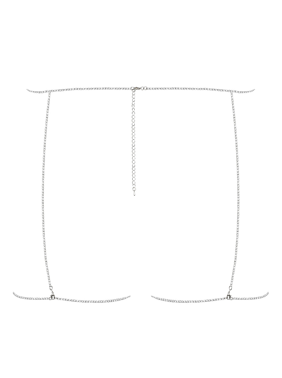 Spotlight-worthy and effortlessly chic, this ultra-sexy jewelry belt redefines the garter with a silver gleam that catches every glance. Start the day with a hint of anticipation, letting the belt glow against silk lingerie and a satin chemise as it moves with you. Designed for versatility, the universal size fits many figures and can be worn in multiple ways. Made from 100% zinc alloy, it delivers durable, lightweight comfort with a shimmering, premium finish. Pair it with silk lingerie, lace bodysuits, or a delicate luxury bralette to ignite sensuality; complete the look with the matching lace thong for a moment of pure indulgence.