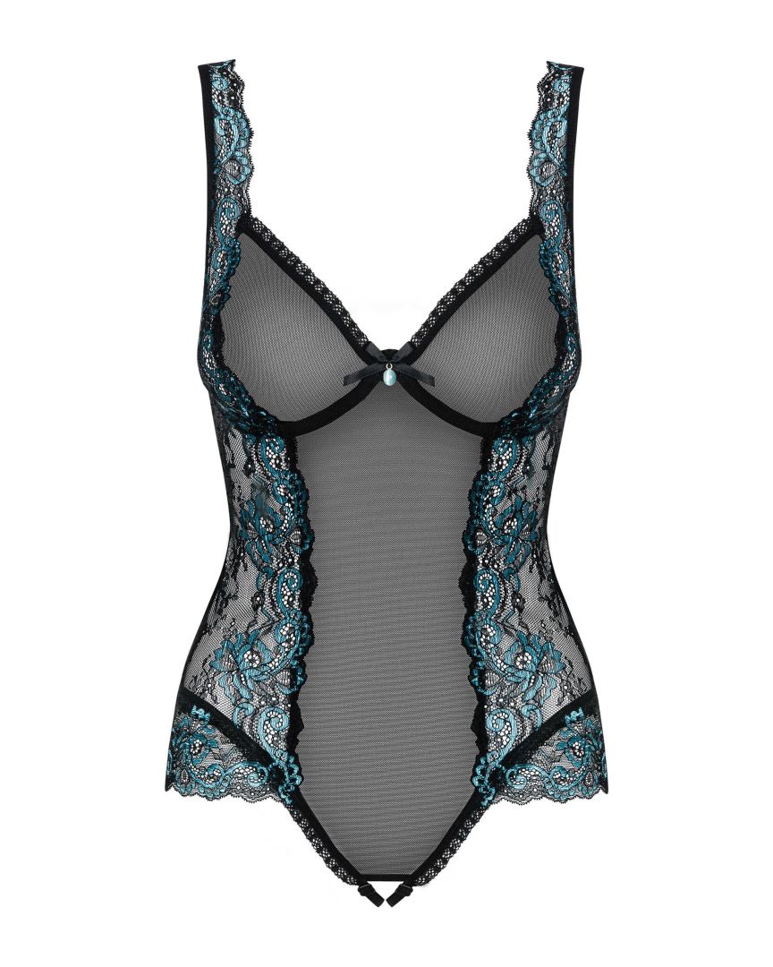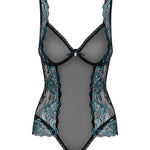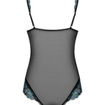 Indulge in the Amanta turquoise teddy, where see-through mesh kisses delicate turquoise lace and turquoise adornments. Regulated straps frame the neckline while underwire cups lift and shape for a flawless silhouette, with a turquoise pendant resting between the cups as a luxe focal point. Lace trims the hips, a smooth back, and slimming lines that glide over every curve, thanks to elastic mesh for a flawless fit. An open crotch adds a daring edge to this luxury lace bodysuit, crafted in 94% polyamide and 6% elastane for a soft, confident wear. Complete the look with the matching lace thong for a moment of pure indulgence.