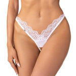 Arrowel White crotchless thong elevates sensual luxury with translucent fabric and decorative lace. Adjustable straps and a soft elastic trim cradle the hips, while a bold front design lends a confident, magnetic silhouette. Nickel-free silver details glint softly against pure white, adding refined elegance to every curve.