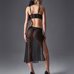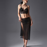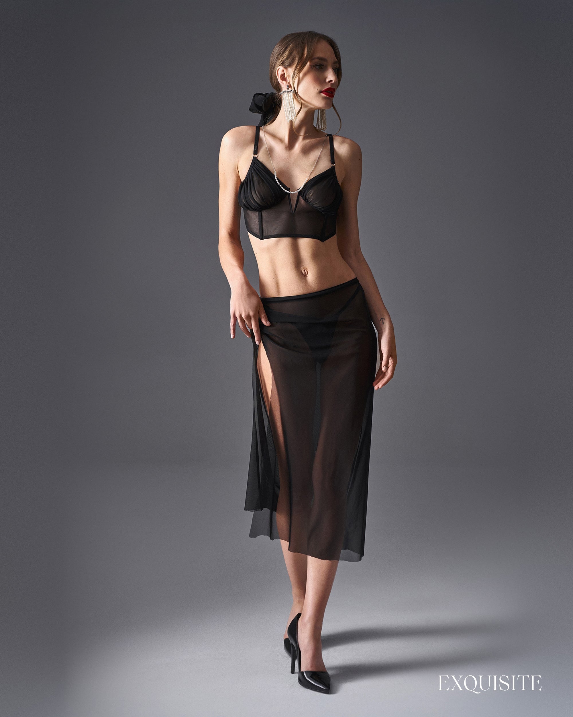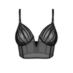 Aurorium Black top sculpts your silhouette with vertical and underbust boning and a plunging V-neck, creating structured, confident lines. Breathable sheer mesh offers provocative transparency, while adjustable straps and a multistage back closure ensure a flawless, customizable fit. Decorative pendant detail and hypoallergenic nickel-free hardware add refined luxury. Crafted in the EU from 94% polyamide and 6% elastane, available in black and white. Silk-soft against the skin, this luxury bralette elevates sensuality and self-expression. Complete the look with the matching lace thong for a moment of pure indulgence.
