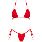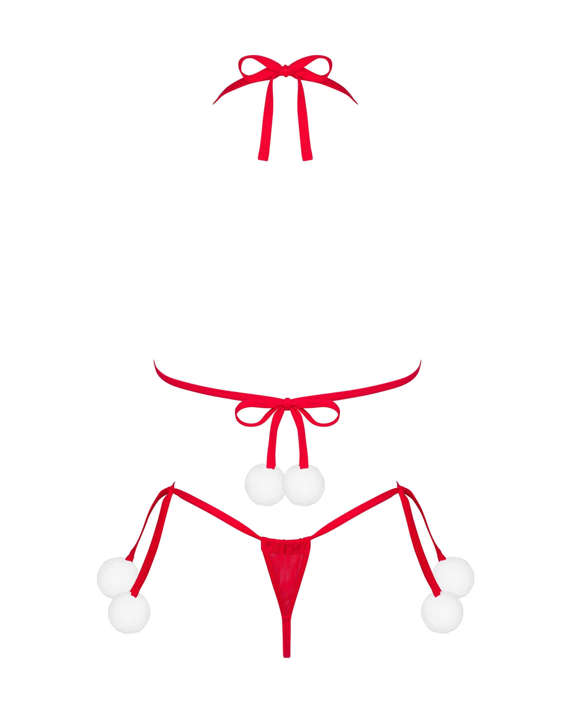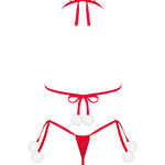 This red lingerie set from Obsessive invites playful luxury into the boudoir. The bra and thong in vivid red, with a luxury bralette-inspired silhouette, are accented with white pompoms that entice touch and movement, while a neck and back binding frames your silhouette with modern, flattering lines. A shimmering pendant catches the light as you move, adding decadent sparkle. Soft, high-quality fabric—94% polyamide, 6% elastane—drapes against the skin for comfort and a flawless, sculpted fit. Bold yet refined, the design blends playful charm with sensual elegance, elevating confidence and self-expression for a truly jolly celebration. Complete the look with the matching thong for a moment of pure indulgence.