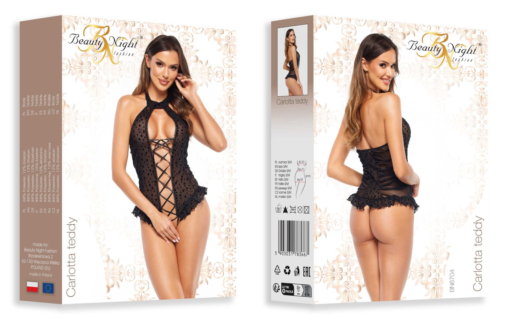 Immerse yourself in the seductive elegance of the Carlotta Teddy in the boldest of shades, black. This exquisite creation from Beauty Night blends size compatibility and material superiority for a work of art with 88% polyester and 12% elastane. Marvel in the perfection of our range with size S/M designed flawlessly for breasts measuring 81-91 cm, B-C cup with a waistline of 56-71 cm and hips proportioned between 85-97 cm. Size L/XL tailored masterfully for breasts 91-107 cm, C-D cup, waist range of 71-91 cm, and hip breadth of 97-112 cm. The fabric's breathability and flexibility guarantee the ultimate comfort, delivering a bearable hug that lovingly complements your every curve. The Carlotta Teddy, with its sophisticated craftsmanship, is excel at enhancing your sensuality, fueling self-expression, and sparkling confidence. Engulf yourself in this suave luxury lingerie and discover an unimagined aspect of your femininity. Complete your enchanting look with a pair of velvet gloves for an experience of unparalleled indulgence.