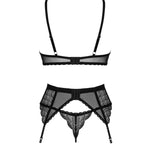 Chemeris three-piece set — bra, thong and garter belt — in black lace with sheer panels that glide over the skin. The fabric offers a silk-like, soft-to-the-touch feel (90% polyamide, 10% elastane), hugging every curve and shaping the silhouette. Padded cups with underwires elevate and define the bust, while multi-stage closures and adjustable straps guarantee a flawless fit. Delicate lace accents and a subtle pendant add a touch of luxury to this enticing lace lingerie set. Stockings are not included—add the matching stockings to complete the look. Embrace confidence, sensuality, and self-expression with a piece designed to make you feel irresistible.