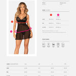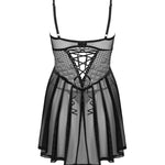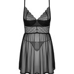Obsessive presents the Chemeris black babydoll and thong — a luxurious fusion of sheer seduction and precise craftsmanship. An airy transparent fabric glides over the skin, accented by delicate lace and subtle patterns for a captivating silhouette. The back boasts adjustable lacing that cinches the waist, while straps and multi-stage fastening ensure a flawless, comfortable fit. Padded underwired cups lift and shape the bust, highlighting your natural lines with refined confidence. High-elasticity fabric promises a smooth, comfortable wear as you move. The thong completes the set with clean lines and a daring finish. Fabrics: babydoll 94% polyamide, 6% elastane; thong 90% polyamide, 10% elastane. Elevate your allure with luxury lingerie that embraces your curves. Complete the look with the matching lace thong for a moment of pure indulgence.