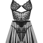 Included in the set are the complementary, stylish thong panties that seamlessly complete this elegant ensemble. To ensure your utmost comfort along with an impeccable fit, the chemise is crafted with adjustable straps that can be tailored to your preference.
