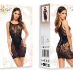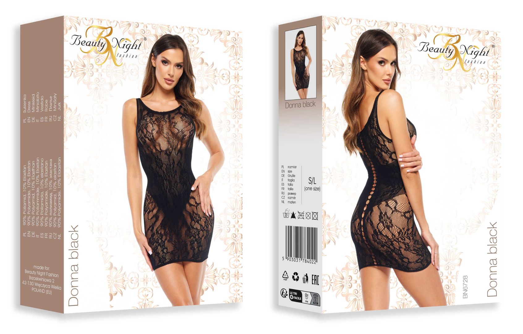 Indulging in extravagance, this seductive Donna dress in obsidian black offers an exquisite blend of comfort and desirability. Crafted by Beauty Night, it elegantly interprets the language of love through a romantic floral pattern, that showers across the clandestine fabric. An alluring surprise awaits at the rear, with a provocative series of cut-outs tracing its enthralling length, each one a signal of adventurous intent. At its core, the material takes a darker, thicker turn, artfully sculpting your silhouette into the finely defined contours of a nocturnal seductress. Each sensual piece gets delivered in an elegant package, complete with an image of the enticing product within. The Donna dress is a testament to the modern embodiment of desire, composed of 90% Polyamide and 10% Elasthane, offering an intimate dimension to your dreams in sizes from S through L. Define your allure with this exquisite creation – a celebration of confidence, carnality, and personal expression.