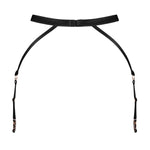 Euridia garter belt: a minimalist marvel of sleek elegance and confident individuality. Crafted in black from flexible premium fabrics (94% polyamide, 6% elastane), it drapes your silhouette with comfortable luxury that transcends trends. A multi-stage hook fastening at the back and adjustable garter straps deliver a flawless, tailor-made fit. Golden rose details glint against the rich matte finish, elevating a timeless design with a luxurious touch. Designed in the EU, this strap garter belt blends comfort, movement, and subtle allureÑthe perfect foundation for silk lingerie or a satin chemise. Complete the look with the matching lace thong for a moment of pure indulgence.