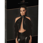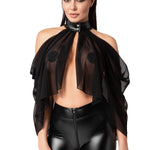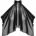 Key characteristics include its supple and elastic mesh fabrication, a material as lightweight as it is comfortable on the skin. The design is versatile, letting you wear it with the shoulders exposed for a laid-back, flowing silhouette. The innovative closure on this breathable top features dual snap buttons on a high collar, enhancing your chic appeal while ensuring perfect fit. This draped accessory beautifully highlights the alluring shape of your shoulders and neckline.