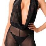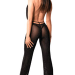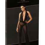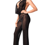 Crafted to illuminate your presence and elevate your allure, this mesmerizing mesh jumpsuit from Noir Handmade redefines sensual luxury. Woven from sumptuously light and subtly sparkling transparent mesh, the piece exudes an enticing shimmer that catches the eye. Each movement basks in the gentle stretch of the fabric, ensuring a seamless fit and indulgent comfort. This alluring ensemble spotlights a provocative neckholder design, creating a tantalizing juxtaposition against the ethereal flow of the wide-legged pants. A simple tie secures the surprising open back – a dash of magnificent eroticism in a landscape of soft elegance. Designed to caress your body, the jumpsuit offers a harmonious play of seductive enhancement and elegant sophistication, narrating a tale of unbridled confidence and self-expression wrapped in exceptional glamour. Make a bold statement imbued with a hint of sparkle on your next special occasion - a night where you command every gaze.