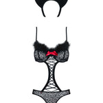 Elevate your boudoir with the Gepardina animal-print teddy from Obsessive—an ultra-luxury piece that fuses sultry silhouette with playful detail. Glossy faux fur accents, a daring spotted motif, and underwire cups lift for a confident, flattering profile, while adjustable straps ensure a flawless fit. The thong features a detachable tail and the set includes matching ears for a complete feline allure, finished with red bows and delicate lacing. Crafted in a silky polyamide-elastane blend (94% polyamide, 6% elastane) for smooth comfort and just-right stretch—a true statement in luxury lingerie.