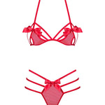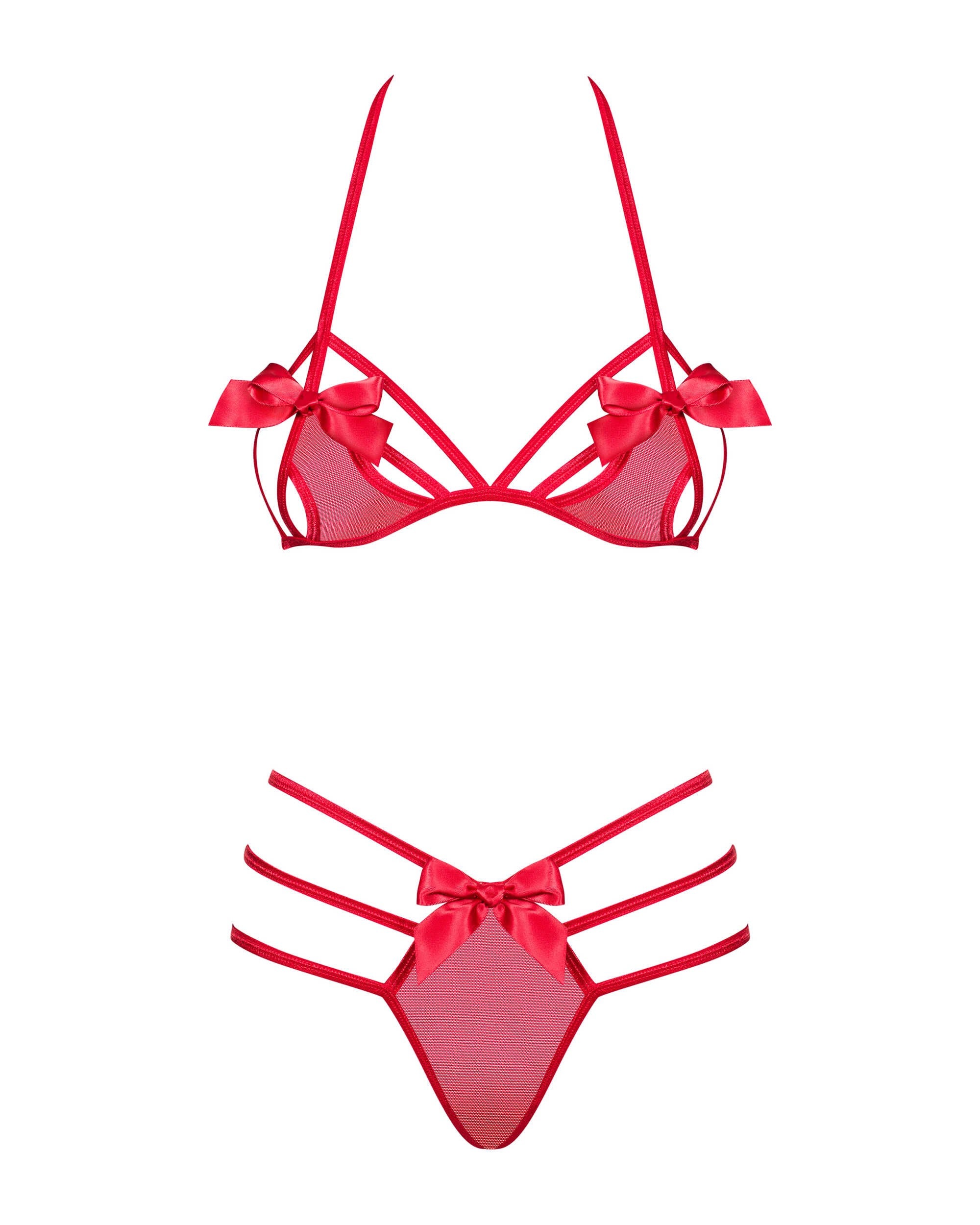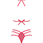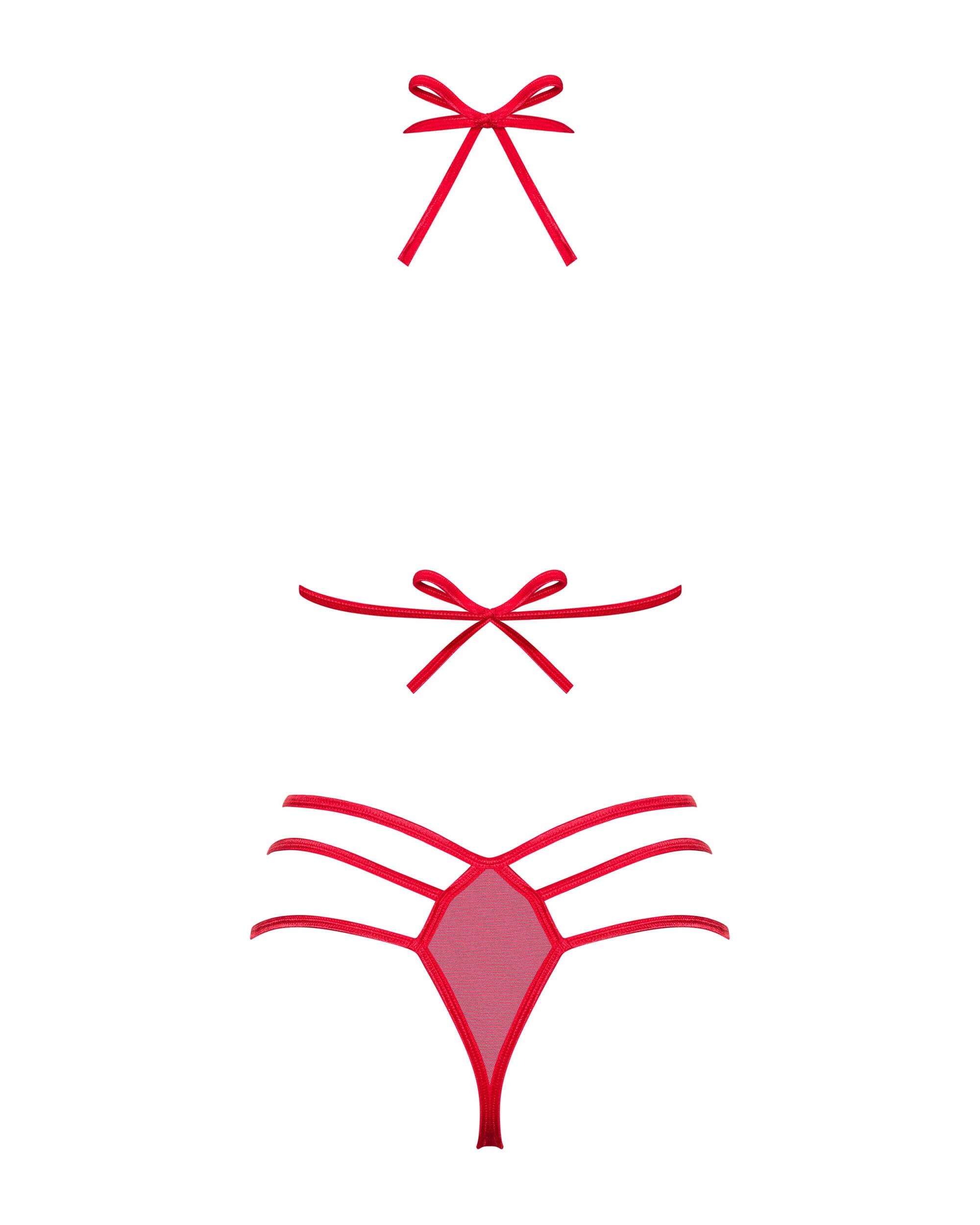 Giftella is a unique two-piece set that sparks confidence and desire. The halter-neck bra features delicate front lacing and a dramatic back lace for a flawless fit and a daring silhouette. The strappy thong traces feminine curves, while three decorative bows add a playful, romantic touch. Crafted in soft mesh with elastic straps (94% polyamide, 6% elastane), this luxury lingerie set moves with you and feels as smooth as it looks. Stockings not included; we recommend self-supporting S808 stockings to complete the look. The set includes a bra and thong—perfect for gifting, or for treating yourself to a moment of pure indulgence. Complete the look with the matching pieces for an irresistible finish.