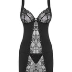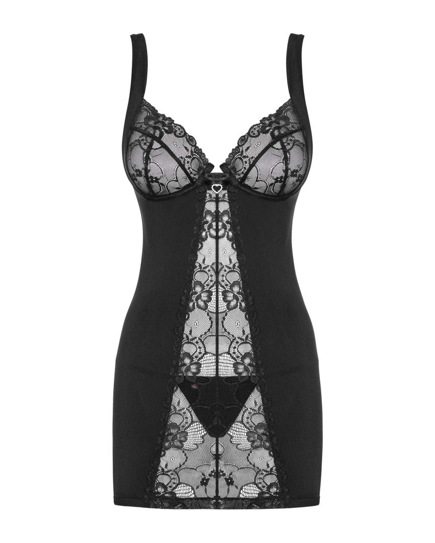 Heartina in black satin chemise, a whisper of luxury that glides over the skin. Flowing floral lace, adjustable straps, and a flattering underwire sculpt the silhouette, while lacy cups frame the bust with refined allure. Sheer panels reveal the belly, back, and derriere, accented by a satin bow and a tiny nickel-free jewel heart for a touch of sparkle.\n\nCrafted from soft, elastic fabric (85% polyamide, 15% elastane) for comfort and a second-skin fit. This set includes chemise and thong, delivering effortless wear and lasting luxury. Elevate your confidence, sensuality, and self-expression with this couture-inspired piece. Complete the look with the matching lace thong for a moment of pure indulgence.