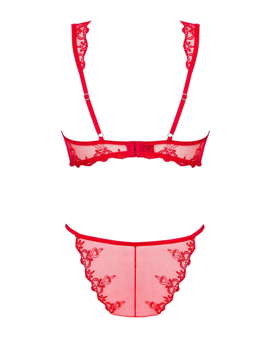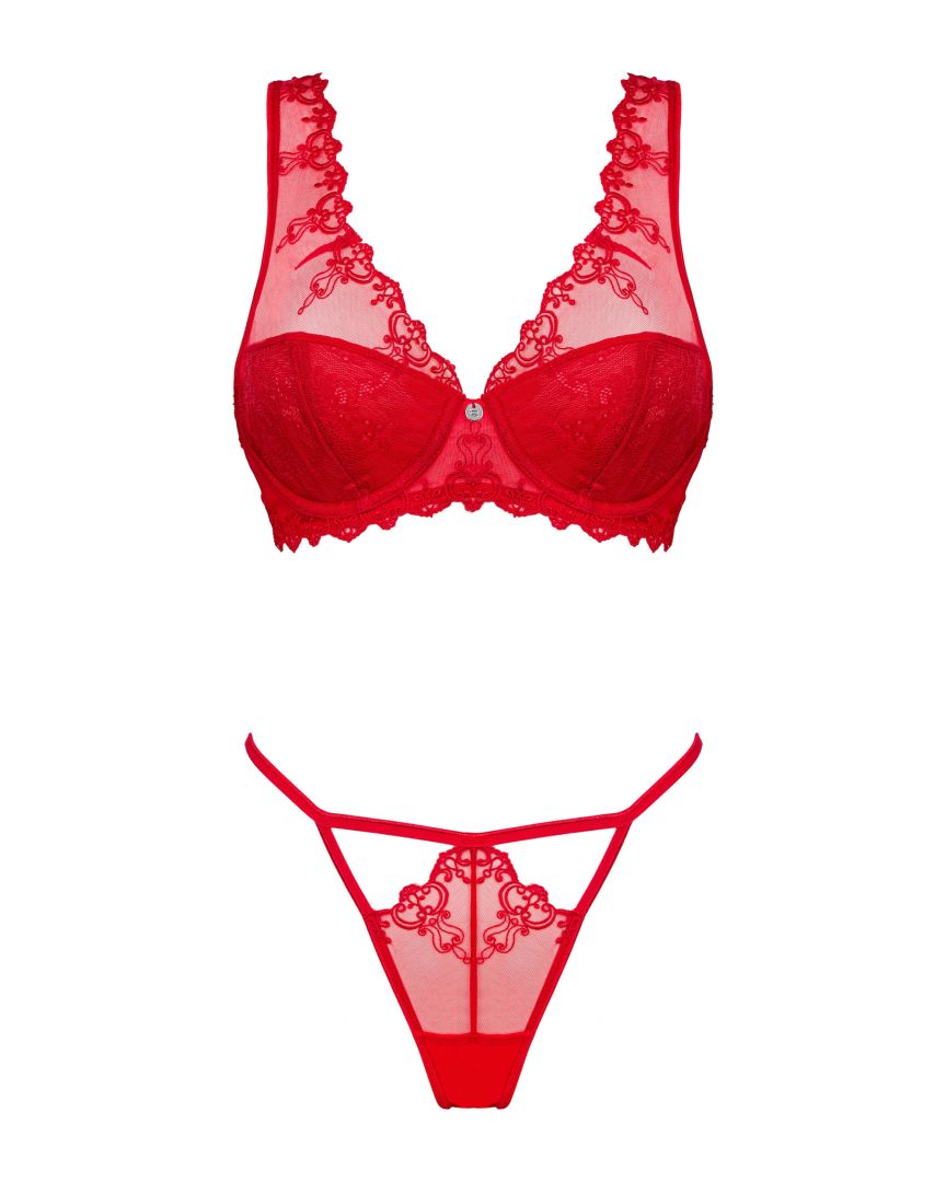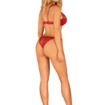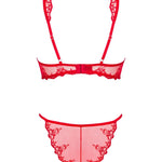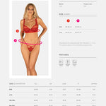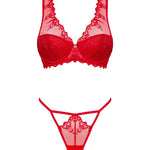 The Lonesia red set from Obsessive is a bold, elegant invitation to indulge in red-hot glamour. The underwired bra offers exquisite support and comfort, with wide straps and a back fastening for a flawless fit. A delicate jewelry pendant sits between the breasts, a charming focal point that elevates the look, while the slightly translucent fabric flatters the hips and derriere. Crafted from 60% polyester and 40% polyamide, this luxury lingerie feels silky to the touch and moves with you. The feminine thong completes the silhouette, enhancing confidence and sensuality. Complete the look with the matching lace thong for a moment of pure indulgence.