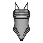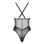 Experience the Lune Bellis teddy by Obsessive Exquisite: a transparent, body-hugging silhouette in deep black. Smooth premium fabric drapes the skin, while dark stripes along the hips and bust create a refined contrast. Adjustable straps cross at the back for a secure, tailored fit and a tantalizing partially exposed back. Designed in the EU from a 94% polyamide, 6% elastane blend and nickel-free, this classic cut flatters the female form with elegant ease. The silk-like texture and fluid movement make it ideal for intimate moments, pairing beautifully with a luxury lace bralette or satin chemise. Complete the look with the matching lace thong for a moment of pure indulgence.