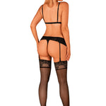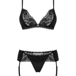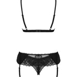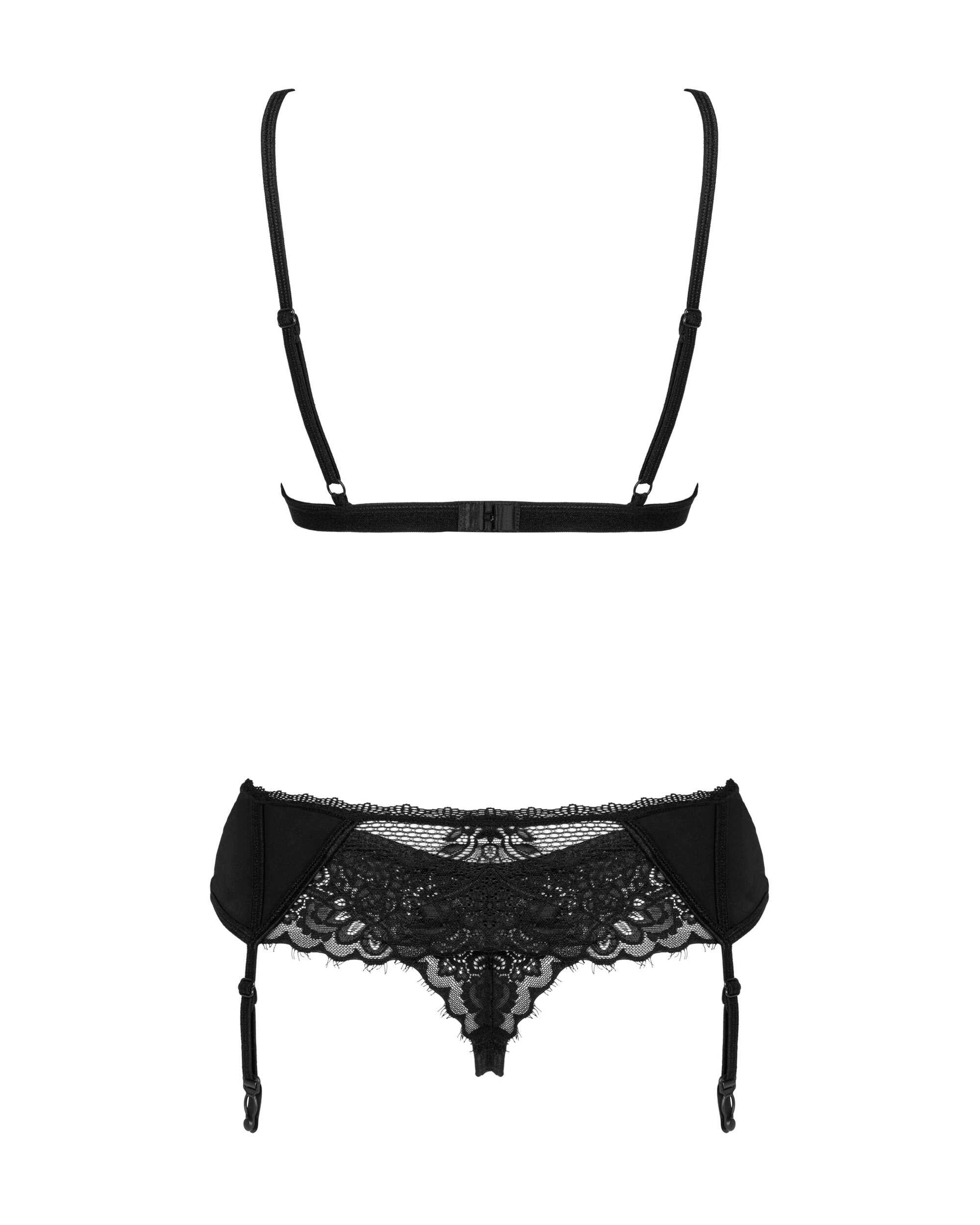 Maderris by Obsessive is a luxury lingerie set that fuses elegant silhouette with seductive texture. This three-piece black ensemble—bra, thong and garter belt—delivers a flawless line, with a multi-stage bra fastening and adjustable straps for a precise fit. Alluring lace inserts trace the curves, while the garter belt features four adjustable straps and a delicate pendant detail for a refined focal point. Crafted from elastic fabric for comfort (90% polyamide, 10% elastane), it moves with you and holds its shape. This set elevates confidence and intimacy, offering a sophisticated, sensual look for private moments and playful reveals. Complete the look with the matching lace thong for a moment of pure indulgence.