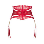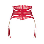Matildea red garter belt, a couture fusion of lace and sheer mesh that glides over the skin. Vertical boning sculpts the silhouette with quiet precision, while a bold strappy motif introduces contemporary allure. Garter straps are linked by decorative golden chains, an elegant finish that catches the light with every movement. The multi-stage back closure ensures a flawless, personalized fit for every curve. Crafted from 90% polyamide and 10% elastane, this nickel-free, hypoallergenic piece moves with you in total comfort. Not suitable for children under 3 due to small detachable parts. This piece is a cornerstone of luxury lingerie—sensual, confident, and unmistakably Obsessive. Complete the look with the matching lace thong for a moment of pure indulgence.