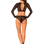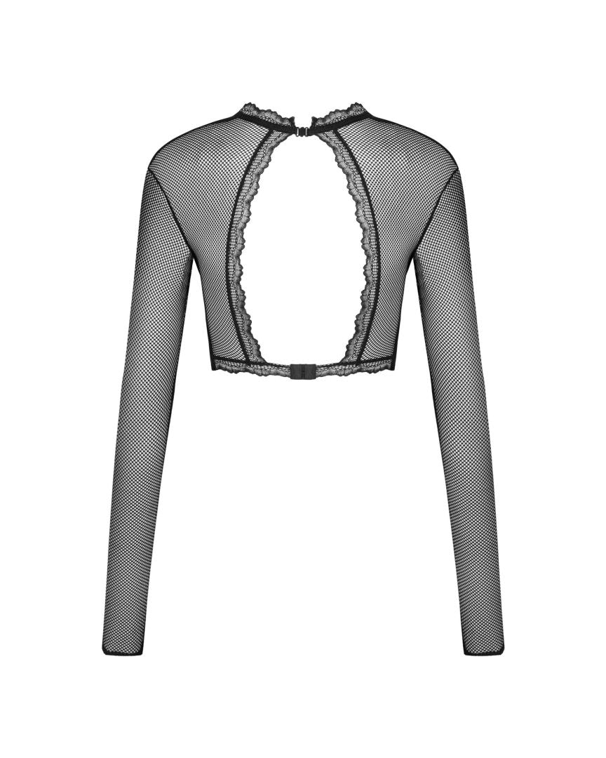 Indulge in the Mibelia top—a refined, seductive silhouette with long sleeves, a daring back cut-out, and open cups that hint at more. Crafted from a softly embracing polyamide-elastane blend (85% polyamide, 15% elastane), this top features underwired cups, adjustable front straps for a precise, comfortable fit, and a secure back fastening for clean lines. A jewelry-inspired neck detail with a shiny pendant rests between the breasts, adding a flash of luxe to every movement. Pair it with coordinating pieces from the collection for a hot, confident look that invites temptation without apology. Complete the look with the matching lace thong for a moment of pure indulgence.