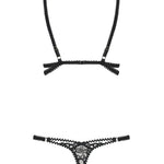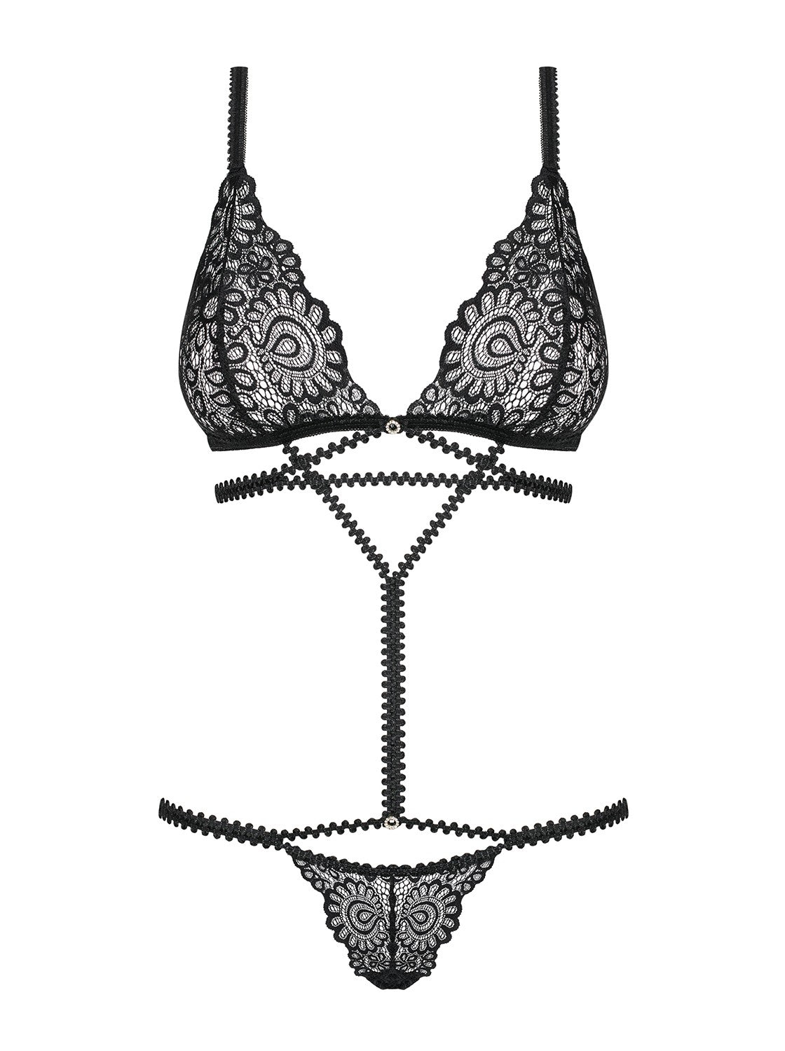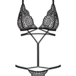 Indulge in the Mixty teddy by Obsessive — a luxury lingerie piece that redefines seduction. This unusual, strappy lace teddy pairs a delicate lace bra with a teasing thong, crafted into a cohesive lace bodysuit. The back-fastening closure, plus two adjustable straps, creates a sculpted silhouette that moves with you. Two shiny rings add a gleaming counterpoint to the elegant lace pattern, while the soft, elastic lace drapes with refined harmony. Made from a premium 90% polyamide and 10% elastane blend, it feels exquisitely comfortable yet confidently body-skimming. Elevate your confidence, sensuality, and self-expression in this silk-like, luxury lingerie essential. Complete the look with the matching lace thong for a moment of pure indulgence.