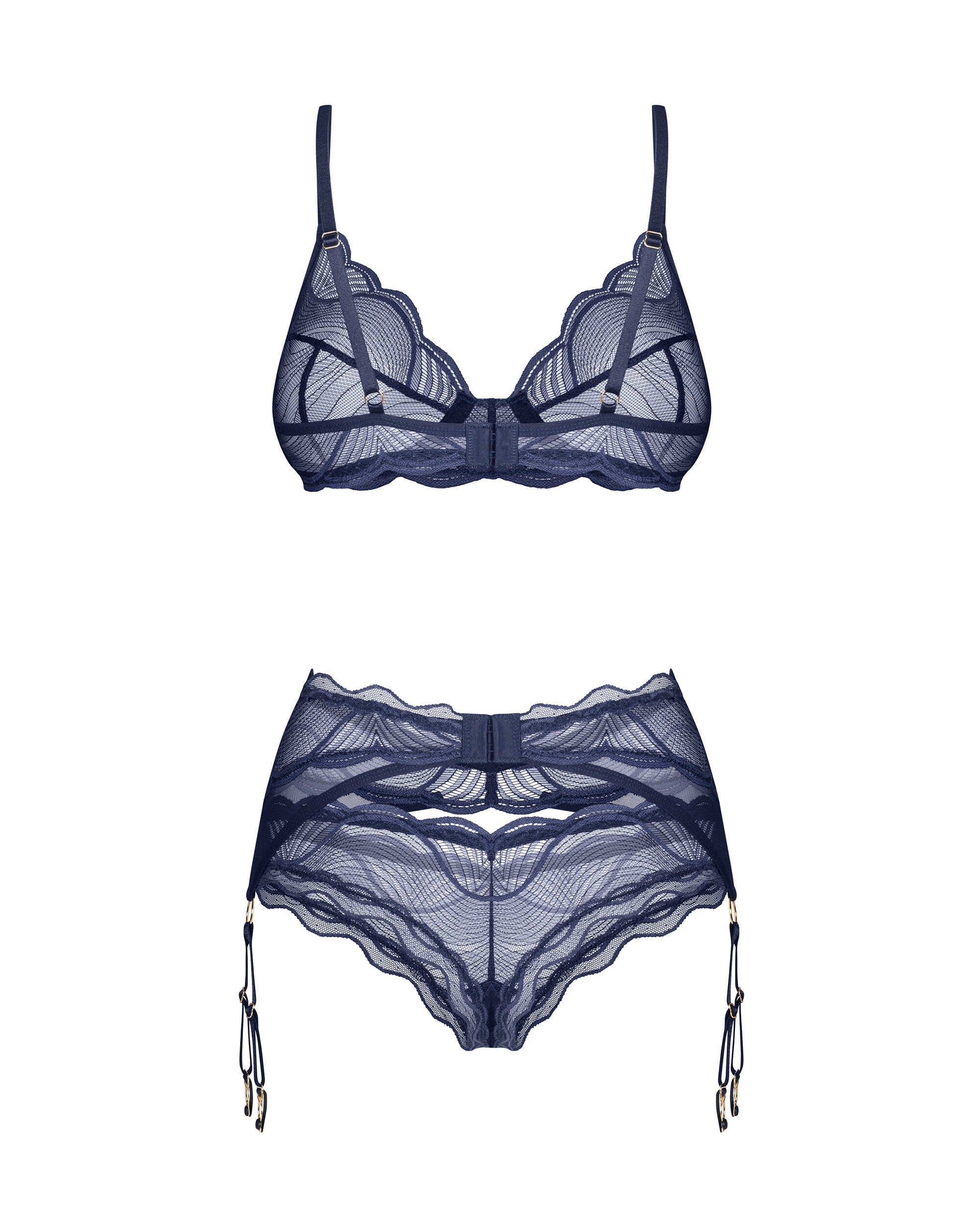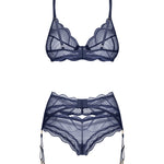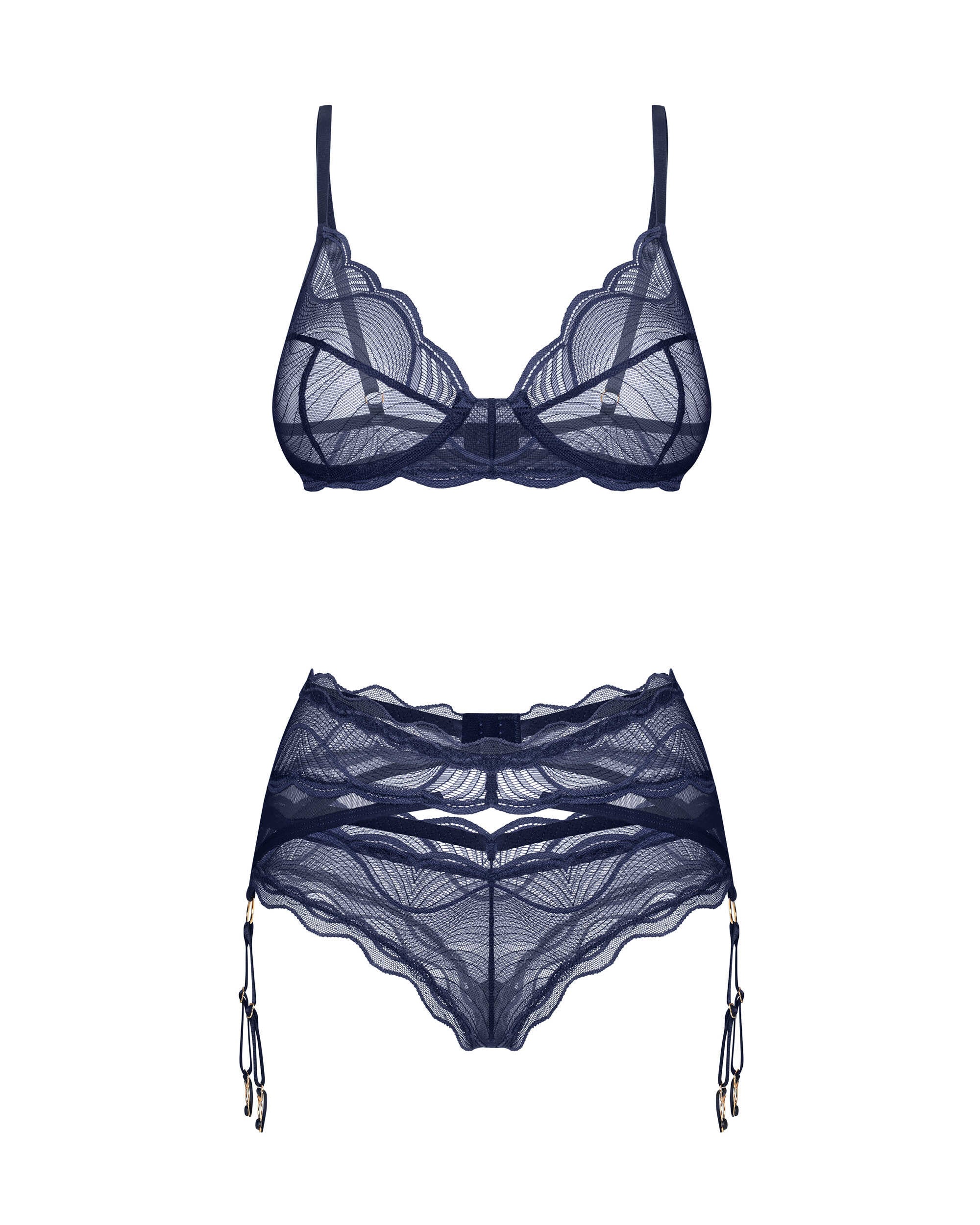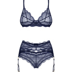 Nightly Blue 3-piece Set elevates navy-blue lingerie to a realm of refined seduction. This elegant trio—bra, garter belt, and panties—features delicate lace with an intricate motif, designed for a chic, tailored silhouette. Adjustable garter straps and a secure multi-stage hook-and-eye ensure a personalized, confident fit, while nickel-free materials keep sensitive skin comfortable. Crafted from a silky blend of 90% polyamide and 10% elastane, the set moves with you in a soft, luxurious touch. Designed by Obsessive in the EU, this luxury lace ensemble elevates confidence and sensuality with every detail, perfectly pairing with a satin chemise or silk lingerie aesthetic. Complete the look with the matching lace thong for a moment of pure indulgence.