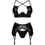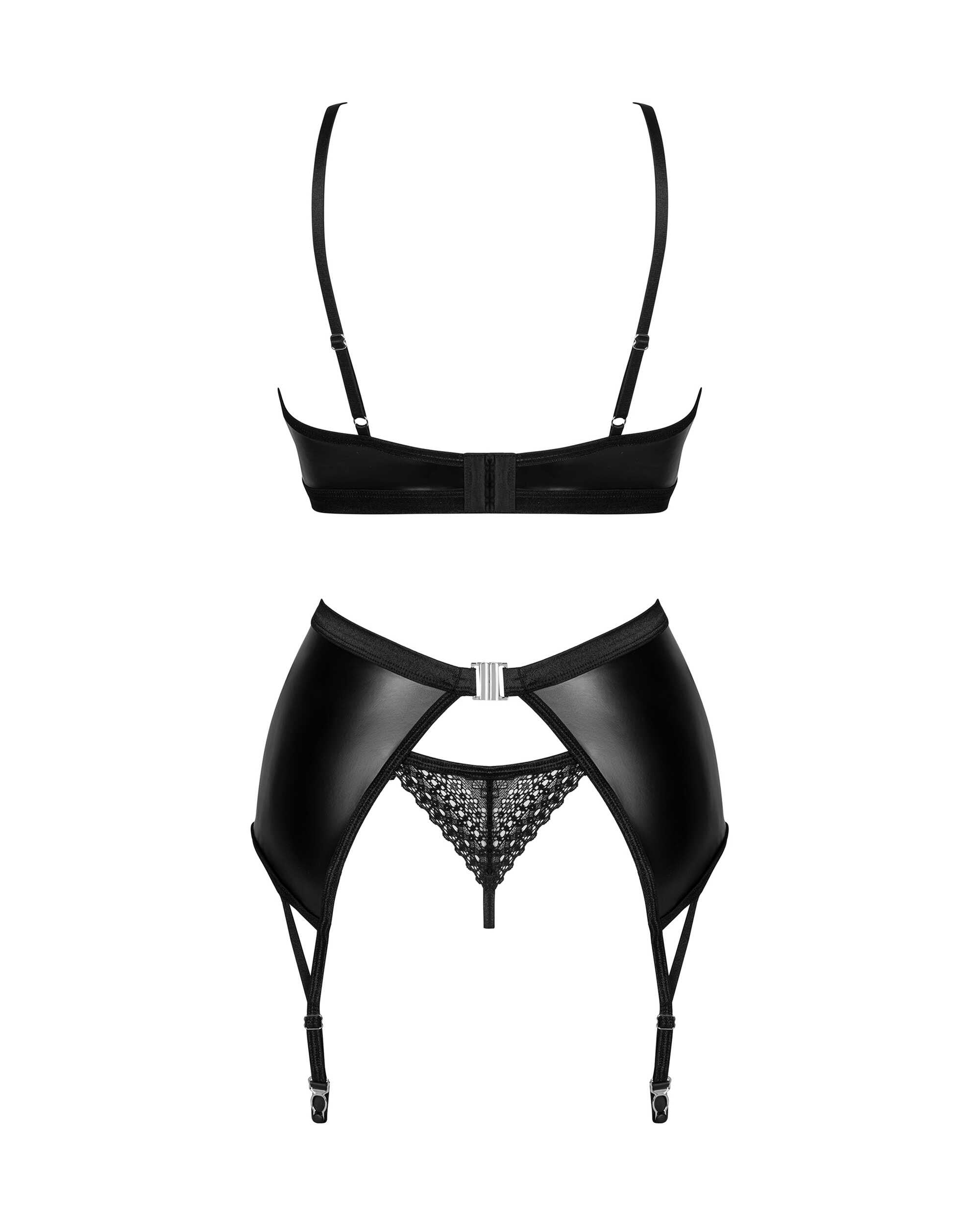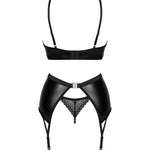 Discover the Norides 3-piece set from Obsessive, a black luxury lingerie trio that sparks desire with a subtle shine and refined lace. This bold collection includes an underwired, structured bra, a coordinating thong, and a garter belt, all accented with lace inserts and a gleaming pendant detail. Enjoy a flawless fit with multi-stage closures and adjustable straps; stockings are not included.\n\nCrafted in smooth polyurethane with stretch panels (90% polyamide, 10% elastane) for a sculpted, comfortable feel against the skin. The deepest black, glossy finish, and sleek silhouette exude confidence and sensuality—perfect for lovers of luxury silk lingerie. Complete the look with the matching pieces for a moment of pure indulgence.