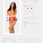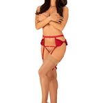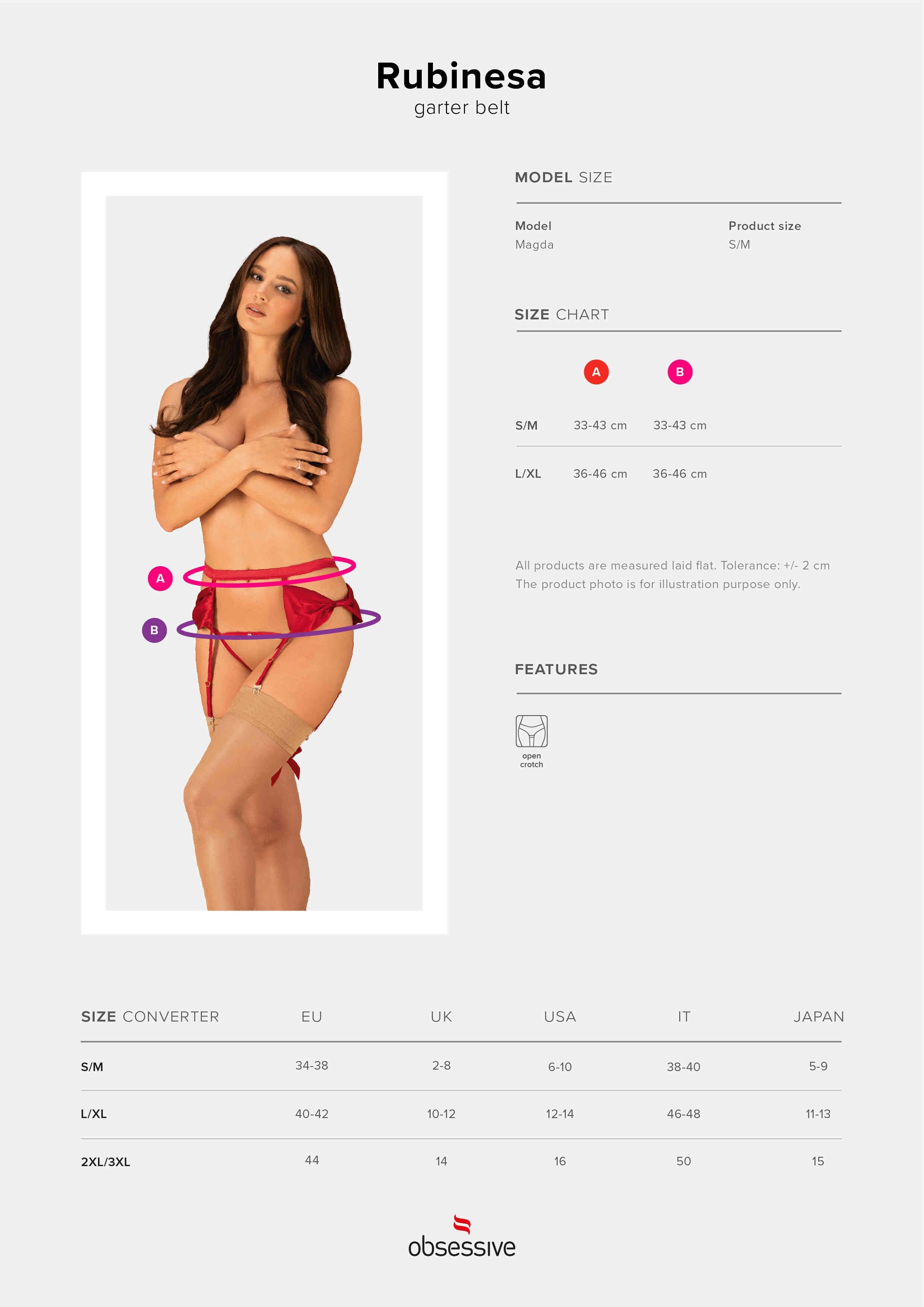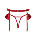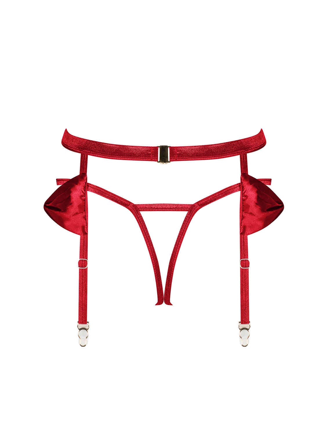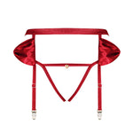 Rubinesa red garter belt - an utterly feminine, satin-drenched piece that invites seduction with every movement. Crafted in soft, flexible fabric (90% polyamide, 10% elastane), it glides over the hips, while satin bows on the sides and a shiny front pendant add a refined sparkle. The open-crotch thong and adjustable garter straps deliver daring allure and a flawless fit. A unique red satin edge finish frames your silhouette, enhancing the luxury feel of this lingerie staple. Complete the look with the matching lace thong for a moment of pure indulgence.
